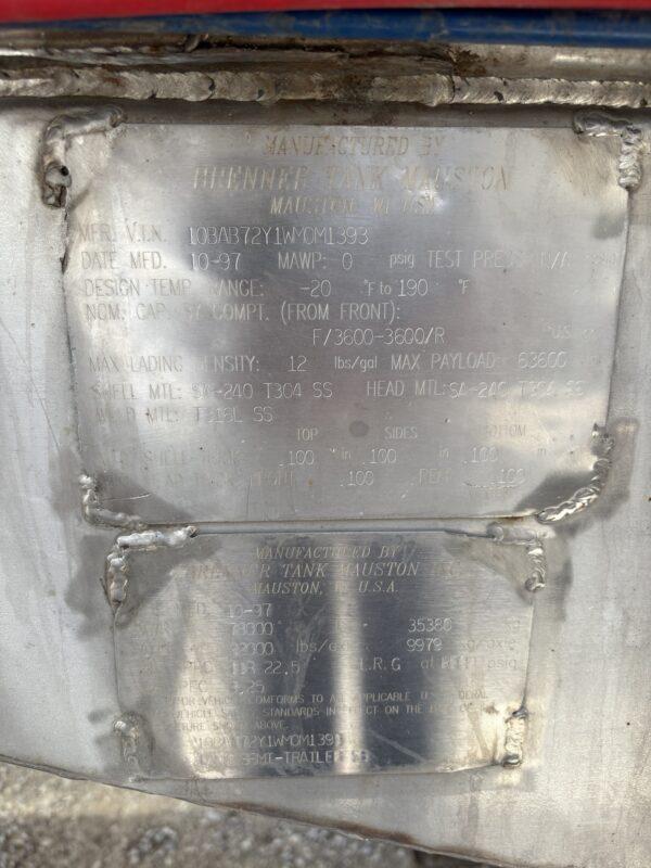 <p>7200 GALLON (3600GL/3600GL), SS RING/BOLSTER WITH SS SUBFRAMES, CIP SYSTEM, CATWALK BETWEEN MANHOLES, TANDEM AXLE, HUB PILOT WHEELS, HENDRICKSON HT250 SUSPENSION, 2.5″JABSCO PUMP.</p>