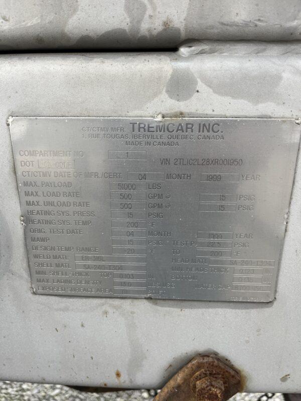 1999 6700 GALLON TREMCAR FOOD GRADE EQUIPPED WITH REAR CABINET, 3″ SS FOOD GRADE PUMP, HOSE TUBES, HENDRICKSON INTRAAX AIR RIDE, & INTRANSIT HEAT