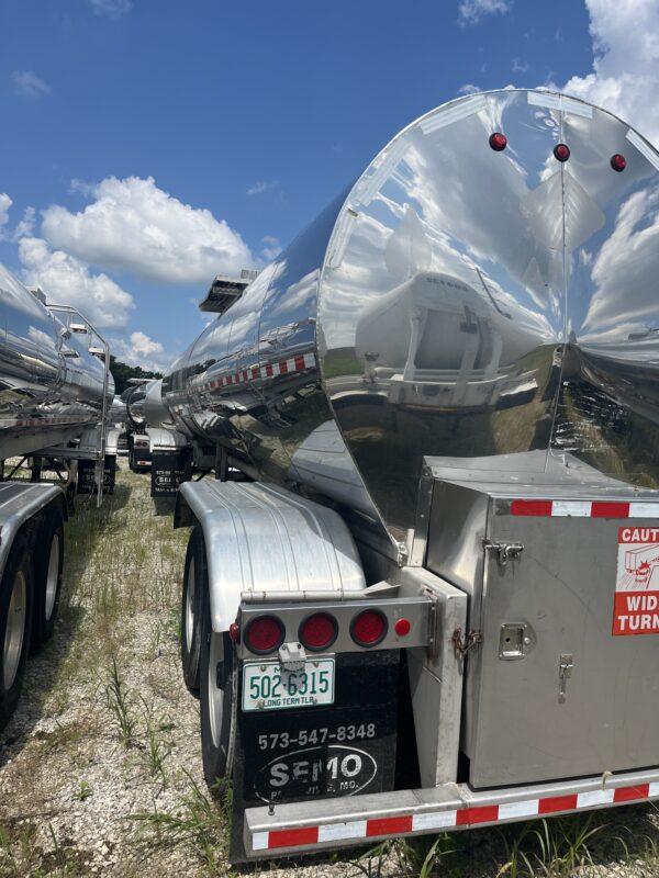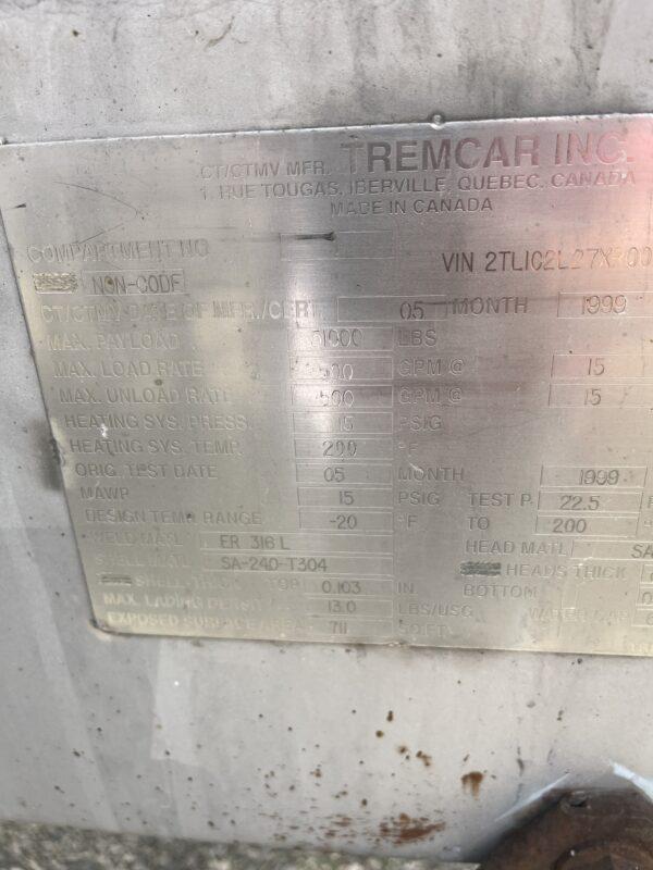1999 TREMCAR 6700 GALLON FOOD GRADE EQUIPPED WITH REAR CABINET, 3″ SS FOOD GRADE PUMP, STAINLESS FRAMES, HENDRICKSON INTRAAX AIR RIDE, LP22.5 SUPER SINGLES, ALUMINUM WHEELS, INTRANSIT HEAT, HOSE TUBES, & HYD LINES