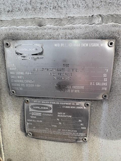 2003 WALKER 6800 GALLON FOOD GRADE EQUIPPED WITH REAR CABINET, 3″ SS FOOD GRADE PUMP, HOSE TUBES, INTRANSIT HEAT, HENDRICKSON INTRAAX AIR RIDE, & ALUMINUM WHEELS.