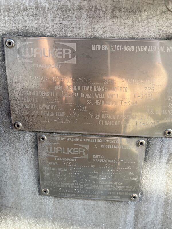 2011 WALKER 7000 GALLON FOOD GRADE EQUIPPED WITH REAR CABINET, SIDE CATWALK, 3″ SS FOOD GRADE PUMP, INTRANSIT HEAT, HOSE TUBES, PSI TIRE INFLATION, SLIDING SPILL DAM COVER, HENDRICKSON INTRAAX AIR RIDE, LP22.5 RUBBER, & ALUMINUM OUTER WHEELS