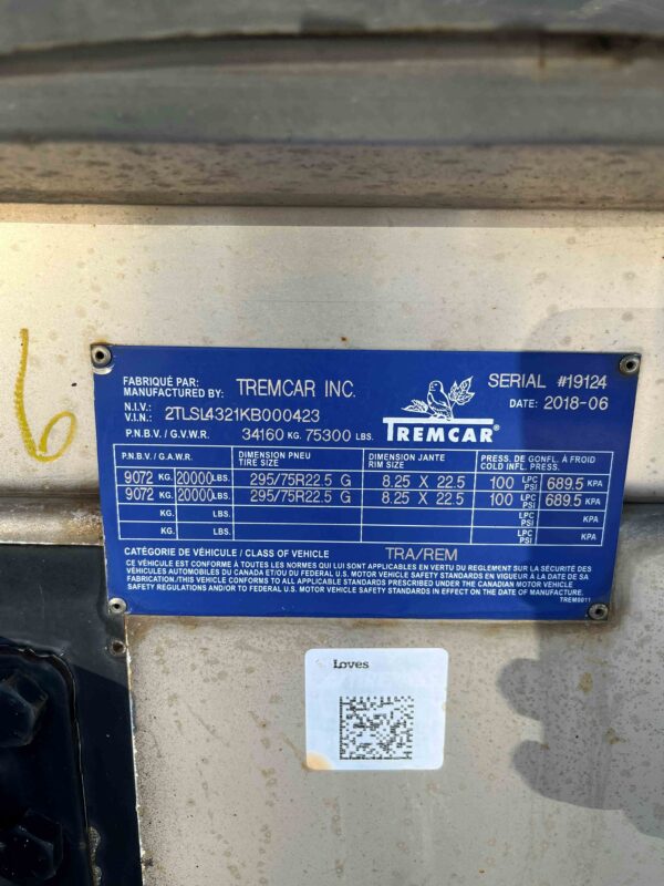 2019 TREMCAR 7000 GALLON FOOD GRADE DOT 407SS EQUIPPED WITH INTRANSIT HEAT, HYD LINES & COOLER, REAR CABINET, HOSE TUBES, 3″ SS FOOD GRADE PUMP, MERITOR AIR RIDE, PSI TIRE INFLATION, DISC BRAKES, ALUMINUM WHEELS, & LP22.5 TIRES
