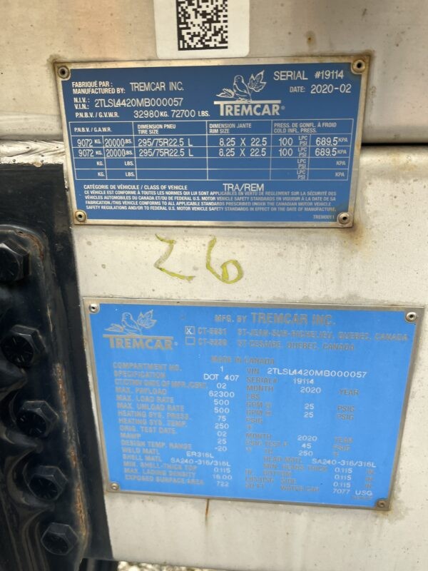 2021 TREMCAR 7000 GALLON FOOD GRADE DOT 407 EQUIPPED WITH THE FOLLOWING OPTIONS: