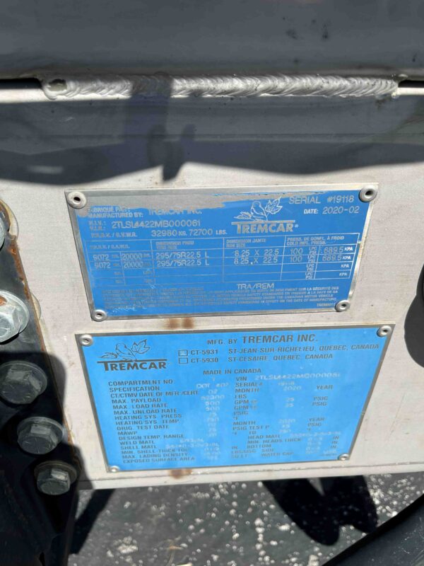 2021 TREMCAR 7000 GALLON FOOD GRADE DOT 407SS EQUIPPED WITH INTRANSIT HEAT, REAR CABINET, 3″ SS FOOD GRADE PUMP, HOSE TUBES, HYD LINES & COOLER, MERITOR AIR RIDE, PSI TIRE INFLATION, DISC BRAKES, ALUMINUM WHEELS, & LP22.5 TIRES